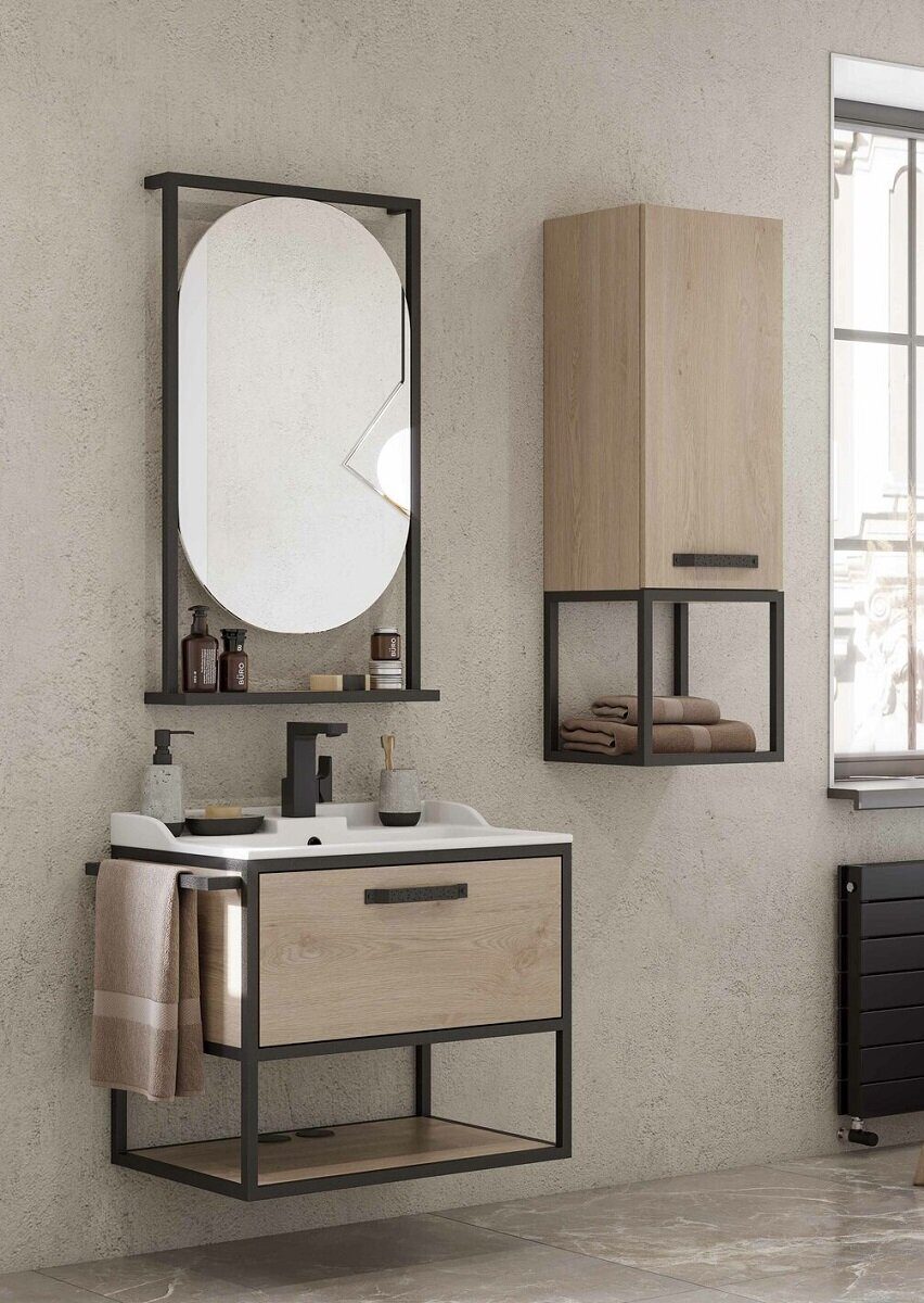 Открытая навесная полка в цвете Дуб Эндгрейн выполнена в форме куба и может использоваться как самостоятельный элемент декора и хранения, а также как дополнение к шкафчику из коллекции Лофт Фабрик. Полка выполнена из черного металлического профиля и влагостойкой ламинированной плиты. Она идеально подойдет для того, чтобы расставить в ванной комнате четкие акценты в дизайне и обеспечить дополнительное место для хранения.