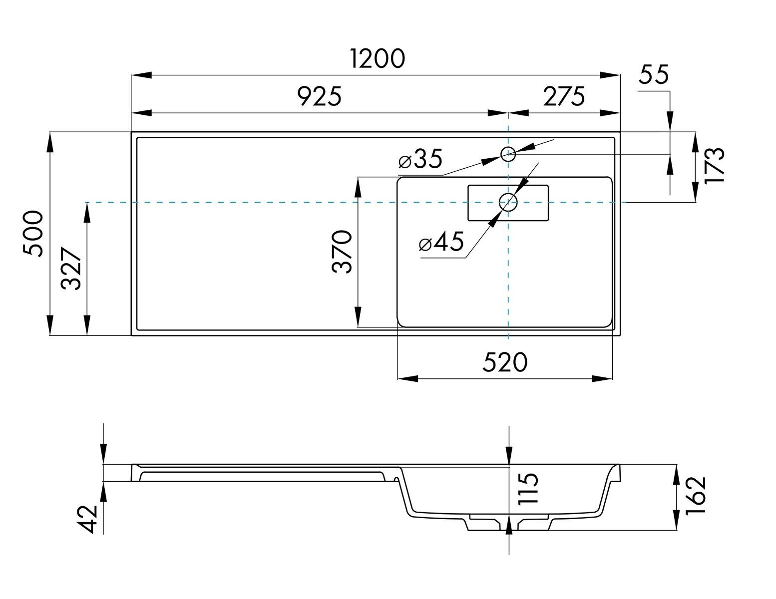 Размеры раковины (мм): высота - 500мм, ширина - 1200мм, глубина - 162мм