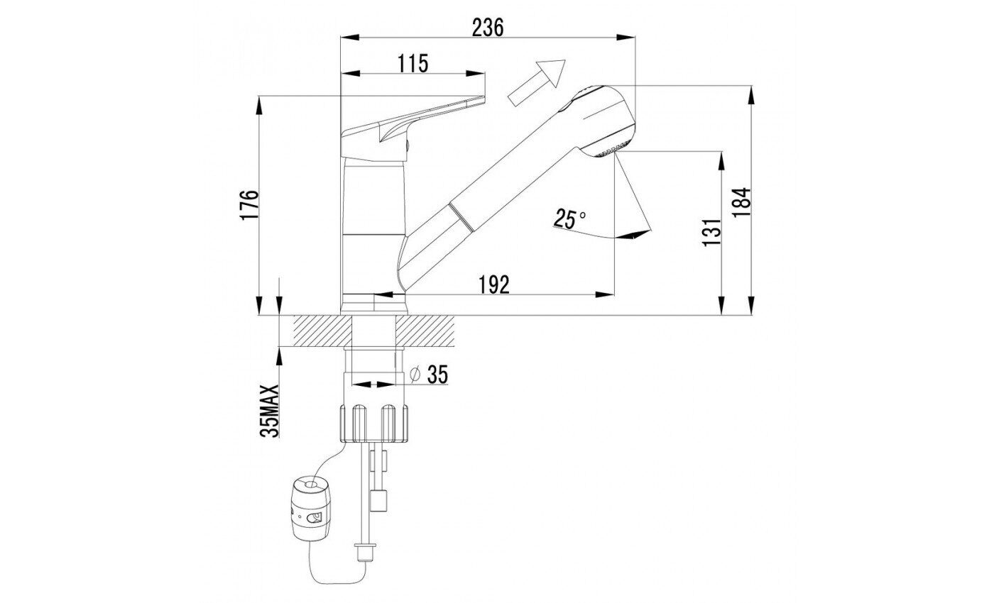 Размер: 33.5×24.5×7.5 см. Излив поворотный выдвижной, длина 19,2 см, высота 18,4 см. Материал: латунь. Комплект: 2-х функциональная излив-лейка с аэратором, Эко-картридж 40 мм, Гибкая подводка 1/2” 35 см, Металлическая рукоятка