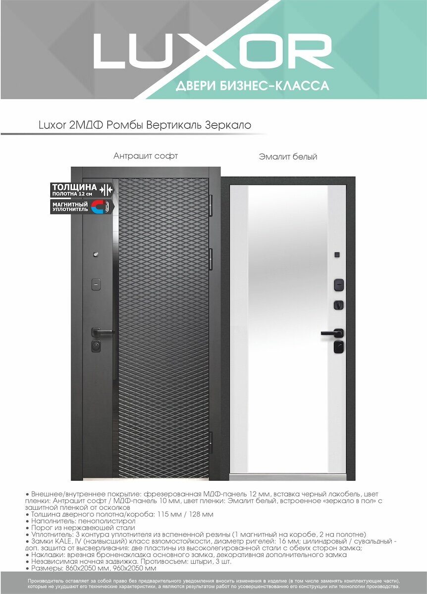 Luxor 2МДФ Ромбы Вертикаль зеркало дверь входная Антрацит софт, Эмалит белый встроенное зеркало в пол