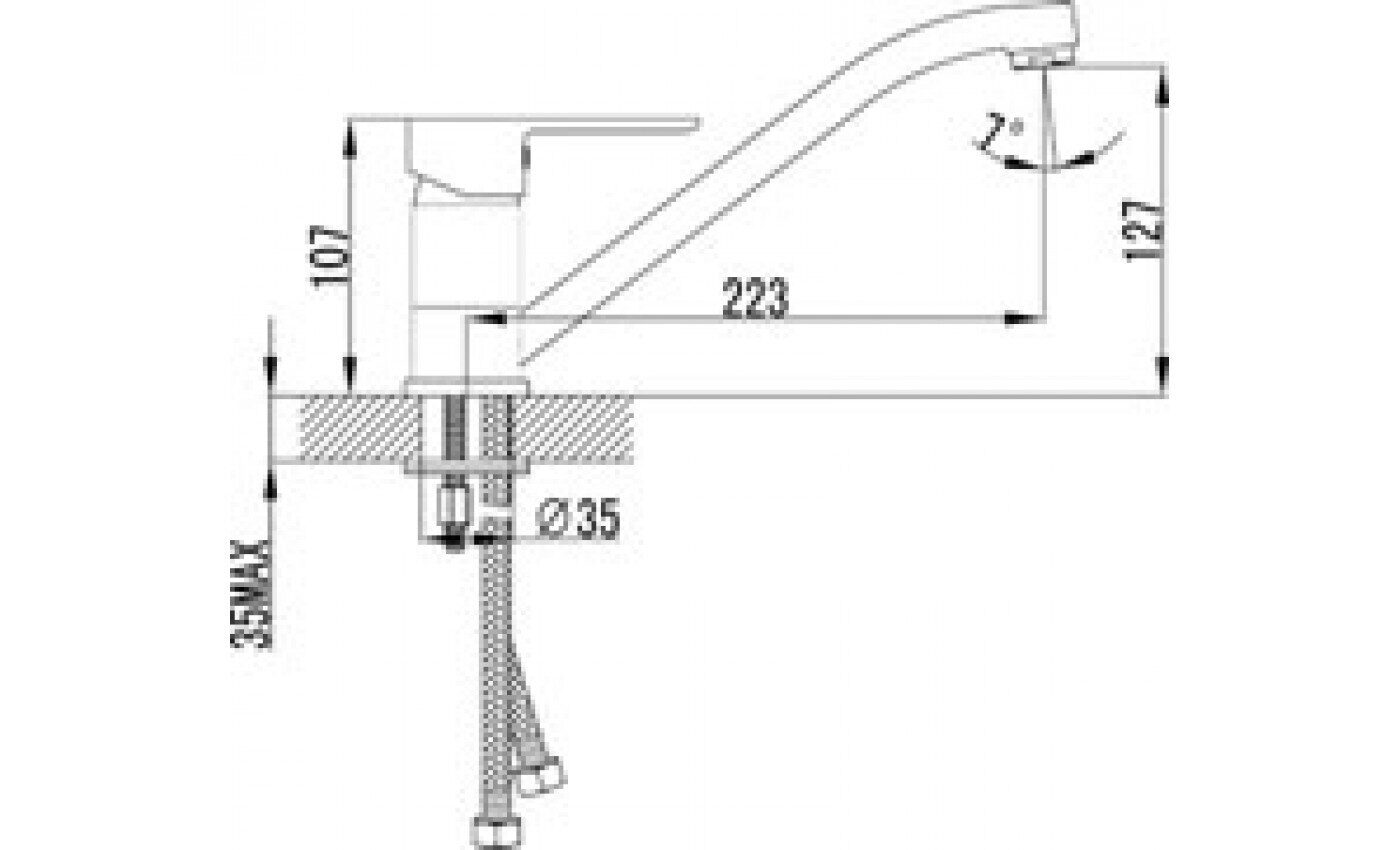 Размер: 28×18×7.5 см. Излив поворотный, длина 22,3 см, высота 12,7 см. Материал: латунь. Комплект: Скрытый аэратор, Керамический картридж 25 мм, Гибкая подводка 1/2” 35 см, Металлическая рукоятка