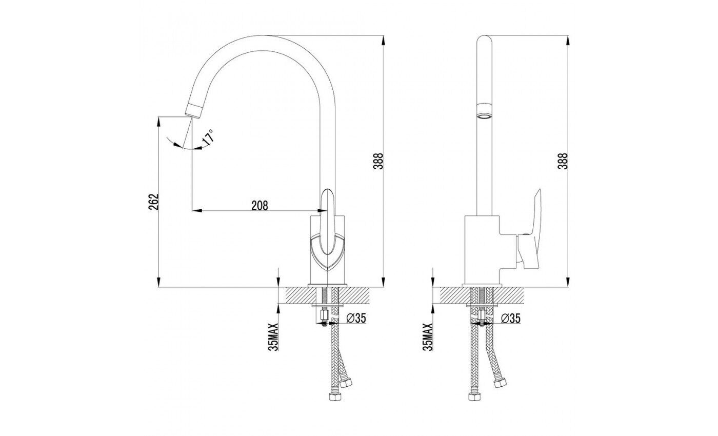 Размер: 23×36×5 см. Излив поворотный, длина 19,1 см, высота 35 см. Материал: латунь. Комплект: Аэратор, Керамический картридж 35 мм, Гибкая подводка 1/2” 50 см, Металлическая рукоятка