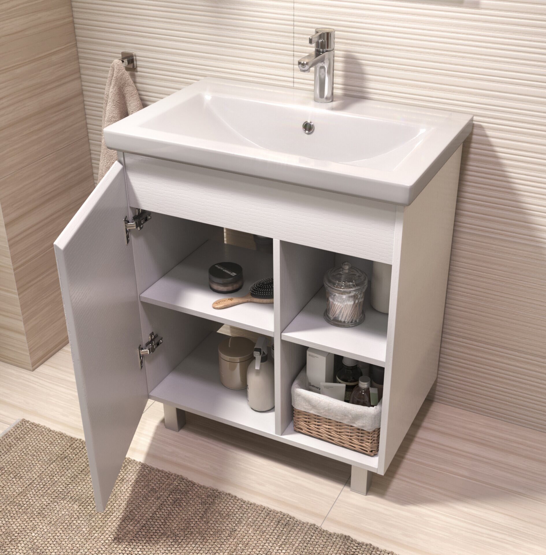 Размер: 66,4х43,4х80 см. Раковина: 70х45х17см. Цвет: белый. 1 дверца, петли с механизмом доводчика, 2 полки ЛДСП, 4 опоры квадратные регулируемые. Поставляется в разобранном виде.