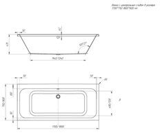 Размер: 170х75 см. Глубина: 43 см. Высота 62 см. Объем 250л. Материал: 100 акрил.