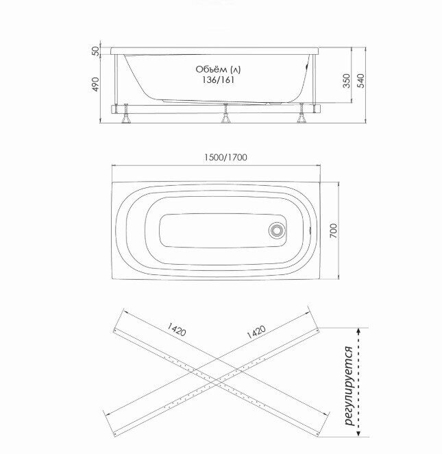 Размер: 170х70см. Глубина: 35см. Материал: акрил. Объем: 0.37 м3