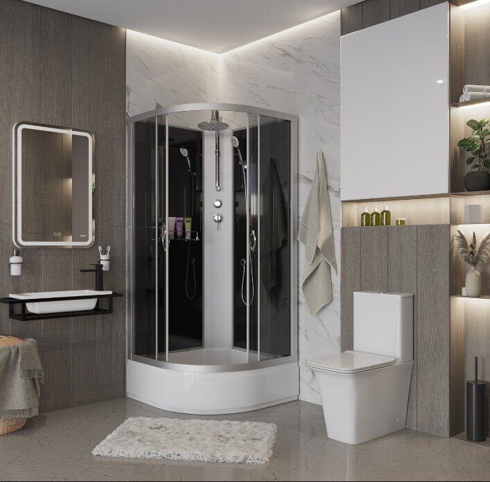 Комплектация: верхний душ, зеркало, полочка, ручной душ