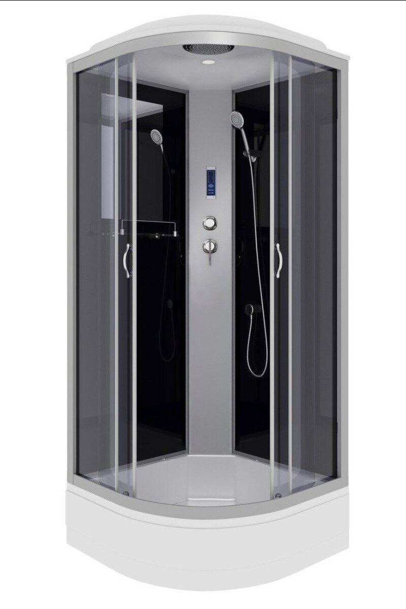 Комплектация: зеркало, полочка, вентиляция, ручной душ, тропический (верхний) душ, радио, освещение