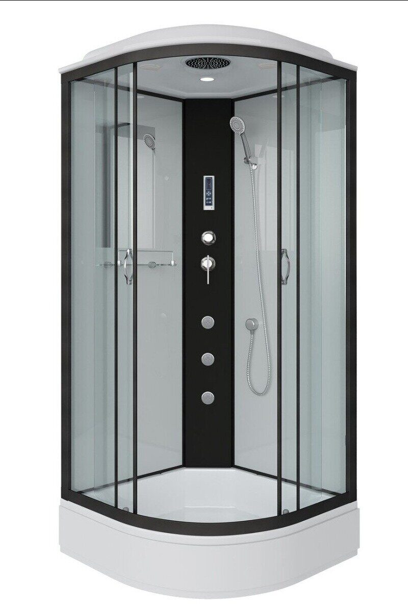 Комплектация: ручной душ, зеркало, полочка, вентиляция, тропический душ (верхний), гидромассаж, освещение, радио, аудио.