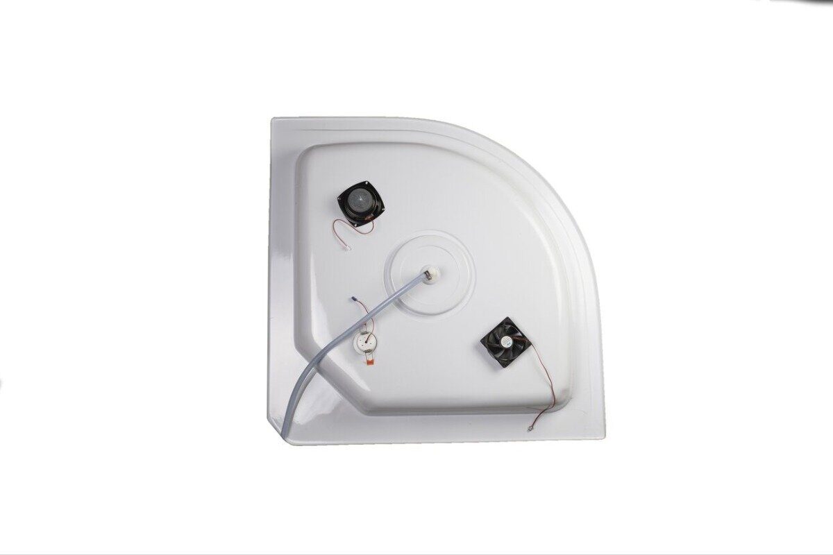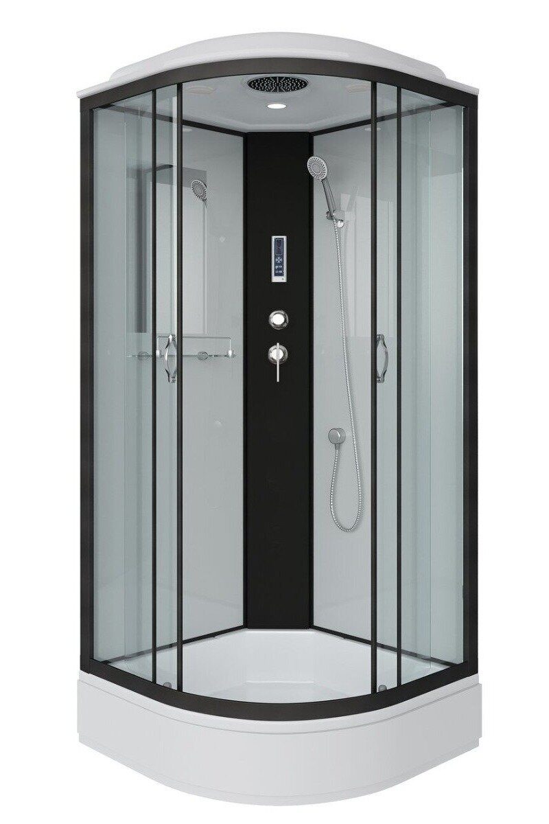 Комплектация: ручной душ, зеркало, полочка, вентиляция, тропический душ (верхний), освещение, радио.