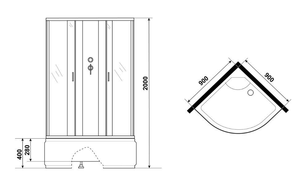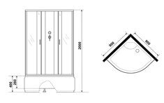 Размеры: 90х90х200 см. Поддон высокий.  Крыши нет.  Двери: 2 шт, закаленное тонированное стекло - 4 мм.  Профиль алюминиевый черный. Комплектация:  ручной душ, зеркало, полочка