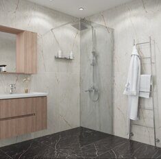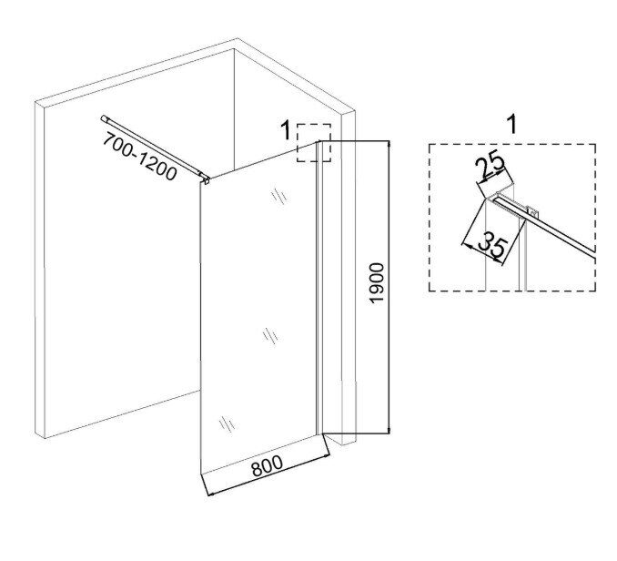 Размеры: 100х200 см. Прозрачное стекло 8 мм. Профиль: хром, анодированный алюминий. Угловое крепление, позволяющее устанавливать перегородку на любом расстоянии.