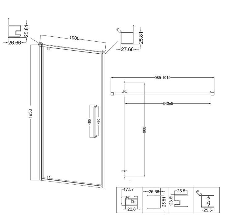 Размеры: 110х90x195 см. Рифленое стекло 6 мм. Анодированный алюминий. Две раздвижные двери из центра. Ручка из нержавеющей стали. Ширина входа: 570 мм.