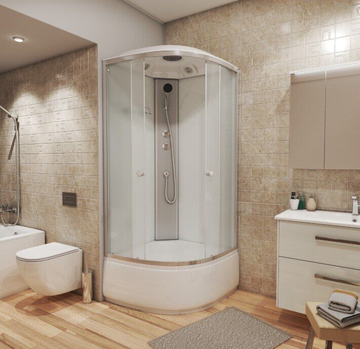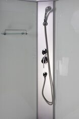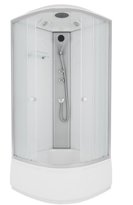 Размеры: 80х80х215 см. Крыша: нет. Вход: спереди. Форма: 1/4 круга. Поддон: высокий, материал - АБС пластик, высота - 40 см, глубина - 27 см. Задние стенки: закаленное стекло матовое - 4 мм. Двери: 2 шт, раздвижные, закаленное стекло матовое - 4 мм. Ширина входа: 38 см. Профиль: аллюминиевый, белый. Цвет корпуса: белый. Комплектация: ручной душ, верхний душ