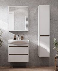 Тумба Нортон 65 в лаконичном дизайне универсальна для любого интерьера ванной комнаты. Корпус тумбы выполнен из влагостойкой ЛДСП, а фасады из МДФ в белой глянцевой покраске. Дизайн тумбы подчеркивает декоративная вставка из ЛДСП с фактурой натурального дерева дуб эндгрейн. Конструктивно тумба состоит из 2 вместительных ящиков, установленных на направляющие с доводчиками для комфортного использования. На тумбе нет выступающих деталей и фурнитуры, открытие ящиков реализовано за счет удобного выреза на фасаде. Тумбу можно использовать в двух вариантах: подвесную или дополнительно приобрести опоры.
