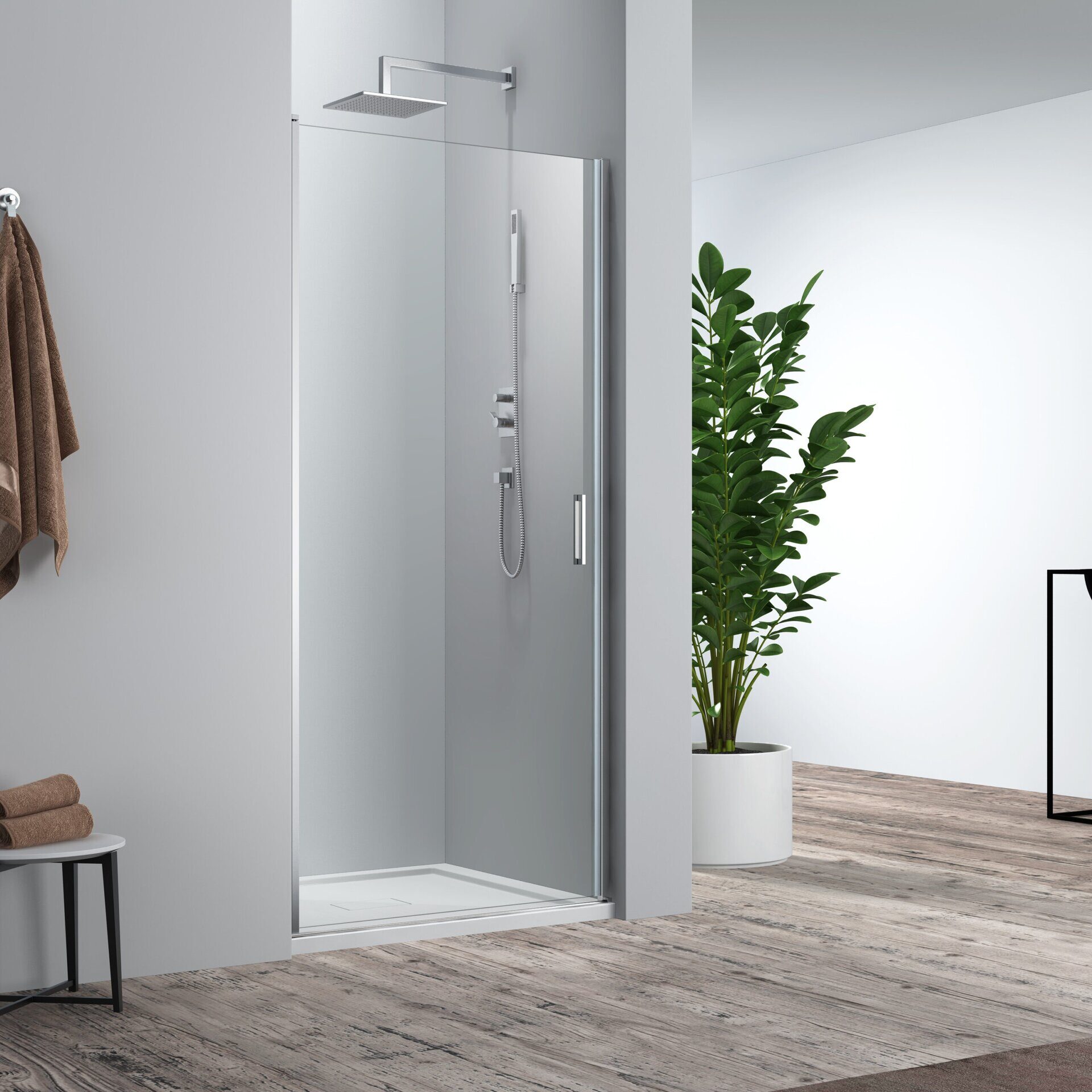 Размеры: 90х190см. Закаленное стекло 6 мм, прозрачное. Профиль алюминиевый хром. Распашная конструкция. Металлическая ручка. Магнитный уплотнитель