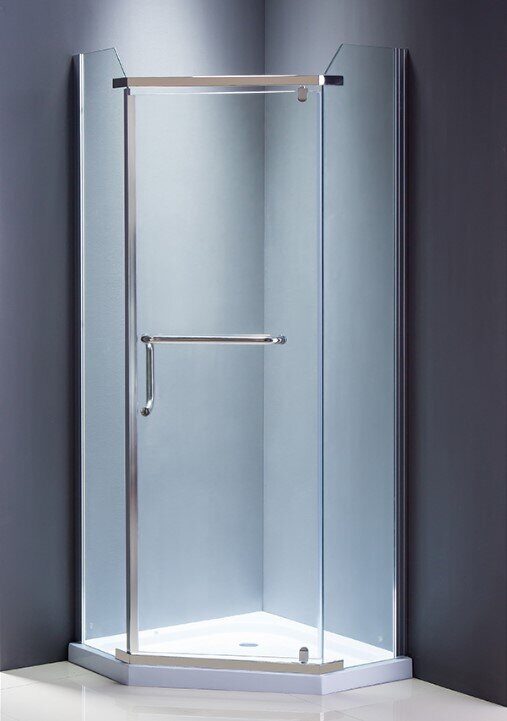 Размеры: 90х90х215см.  Закаленное стекло прозрачное, 8мм.  Трапециевидная форма. Одна распашная дверь. Монтаж: на пол, на поддон