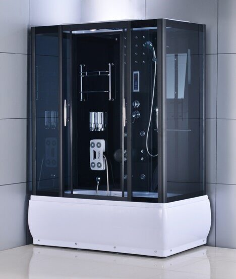 Размеры: 150х85х215 см. Глубокий акриловый поддон. Закаленное стекло 4 мм, тонированное. Профиль алюминиевый черный. 2 откатные двери. Комплектация: тропический и ручной душ, полка стеклянная, вытяжка, гидромассаж 8 форсунок, гидромассаж стоп, декоративная подсветка, зеркало, дозатор для жидкого мыла, цифровой пульт управления с радио, сиденье с опорой под спину, двойные ролики верх и низ