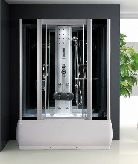 Комплектация: тропический и ручной душ, полка стеклянная, вытяжка, гидромассаж 8 форсунок, декоративная подсветка, зеркало, дозатор для жидкого мыла, цифровой пульт управления с радио, сиденье с опорой под спину, гидромассаж стоп