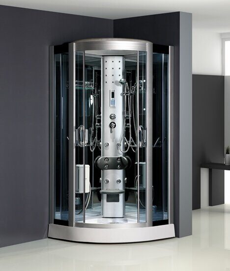 Комплектация: тропический и ручной душ, полка стеклянная, вытяжка, гидромассаж 8 форсунок, декоративная подсветка, зеркало, дозатор для жидкого мыла, цифровой пульт управления с радио, сиденье с опорой под спину, гидромассаж стоп