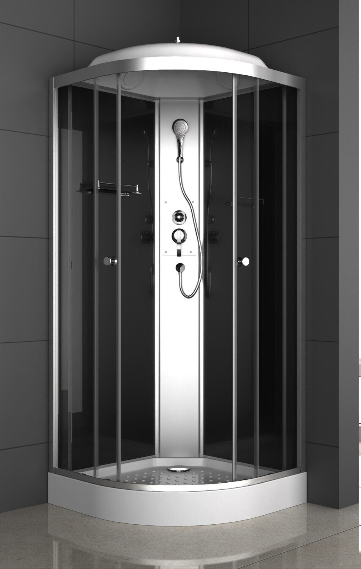 Размеры: 100х100х215см. Низкий акриловый поддон. Закаленное стекло 4 мм, тонированное черное. Профиль алюминиевый серебристый. 1 откатная дверь. Комплектация: тропический и ручной душ, стеклянная полочка, вентиляционная решетка