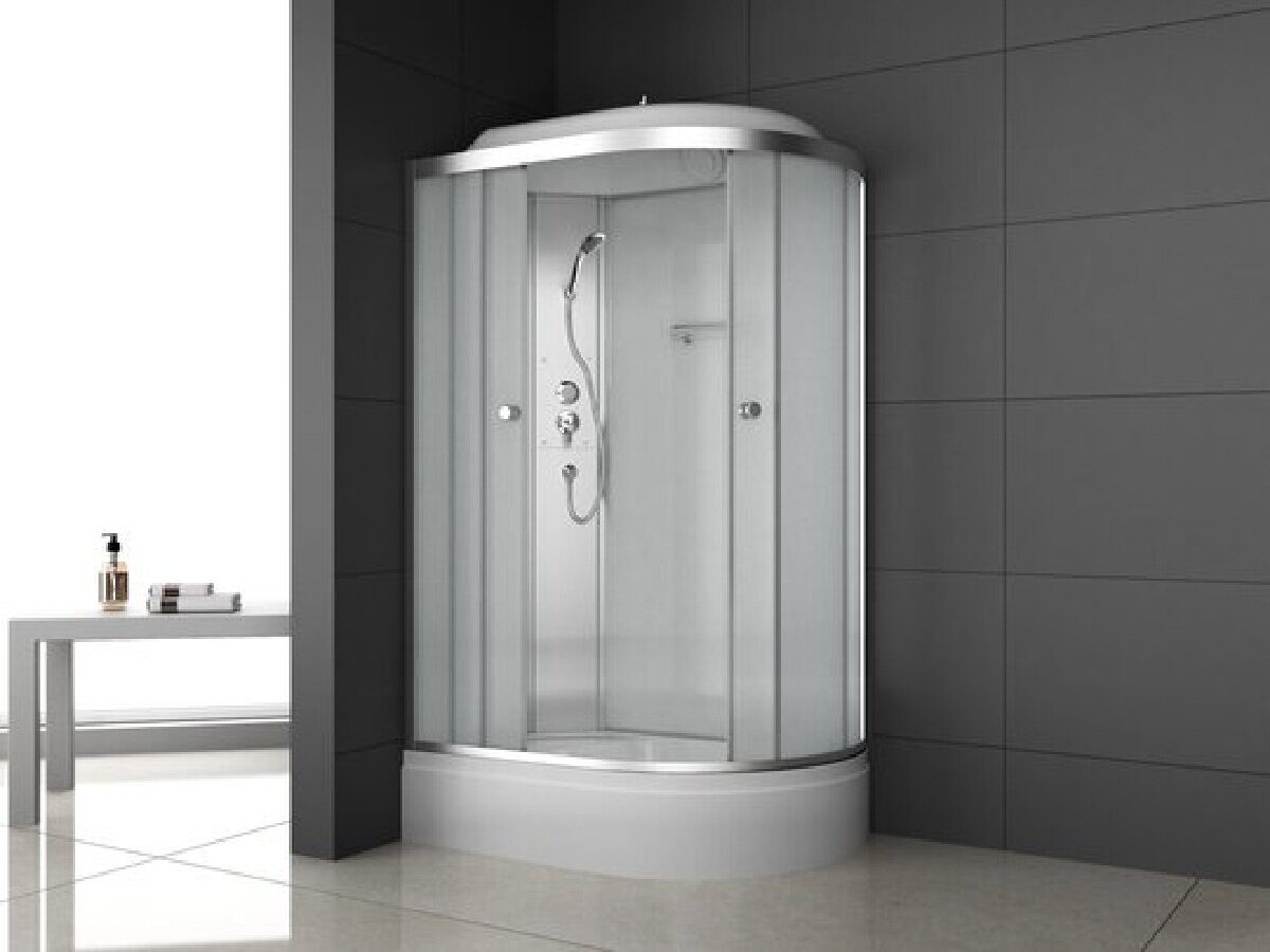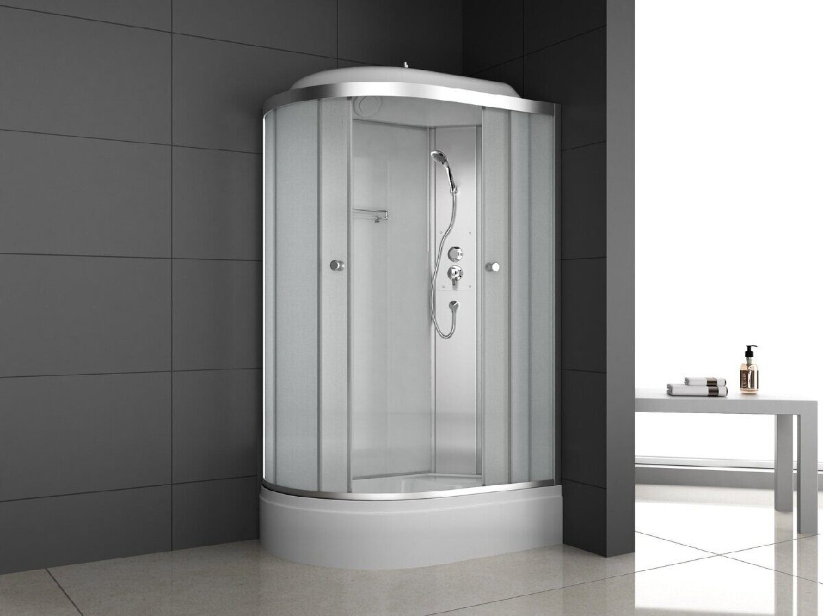 Размеры: 120х80х215см. средний акриловый поддон. Закаленное стекло 4 мм, матовое белое. Профиль алюминиевый серебристый. 1 откатная дверь. Комплектация: тропический и ручной душ, стеклянная полочка, вентиляционная решетка