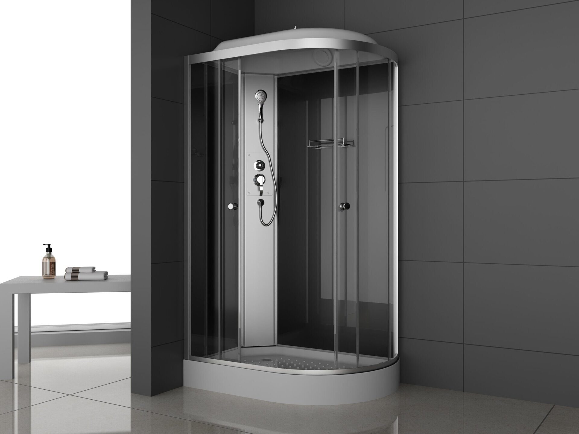 Размеры: 120х80х215см. Низкий акриловый поддон. Закаленное стекло 4 мм, тонированное черное. Профиль алюминиевый серебристый. 1 откатная дверь. Комплектация: тропический и ручной душ, стеклянная полочка, вентиляционная решетка. Правая или левая модель: выбирается при заказе