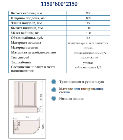 Размеры: 120х80х215 см. Глубокий акриловый поддон. Закаленное стекло 4 мм, тонированное. Профиль алюминиевый серебристый. 2 откатные двери. Комплектация: тропический и ручной душ, полка стеклянная, вентиляционная решетка, смеситель 3 режима, гидромассаж 6 форсунок. Правая или левая модель: выбирается при заказе.
