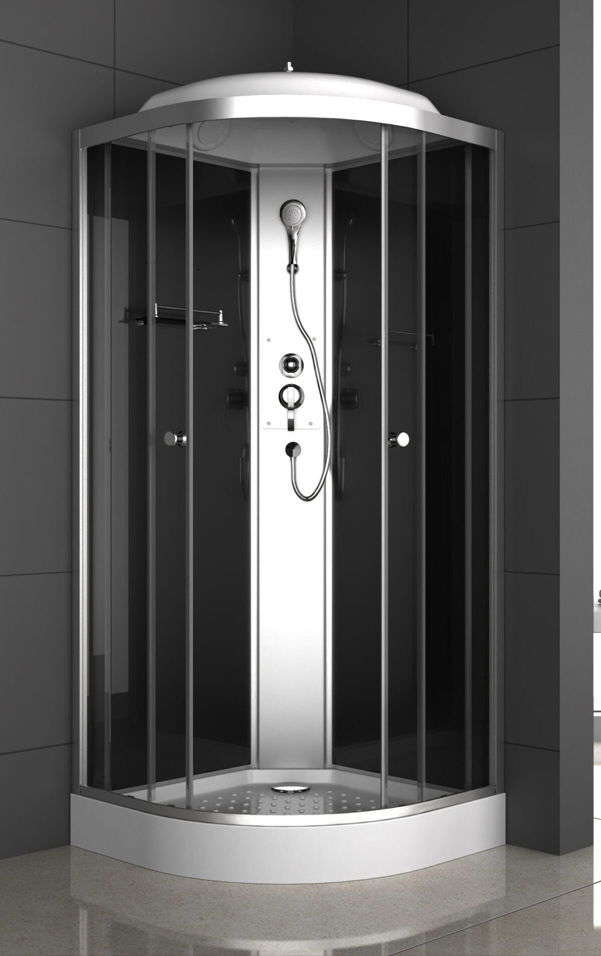 Размеры: 90х90х215 см. Низкий акриловый поддон. Закаленное стекло 4 мм, тонированное. Профиль алюминиевый серебристый. 2 откатные двери. Комплектация: тропический и ручной душ, полка стеклянная, вентиляционная решетка