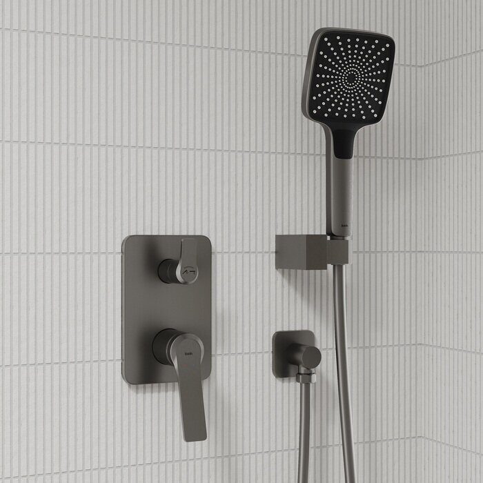 Встраиваемая душевая система Parker в матовом графите - практичная и стильная, ее дизайн сочетает в себе трендовый минимализм форм и четкие грани.Готовый набор включает всё необходимое для создания уютного и функционального пространства: смеситель, верхняя лейка с кронштейном для тропического душа, большая ручная лейка с 3 режимами, душевой шланг 1,5 м и выход для подключения шланга с держателем для лейки.