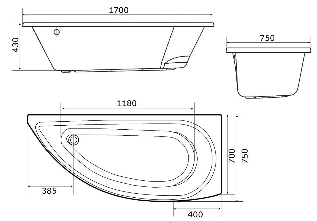 Асимметричная акриловая ванна Piccolo представлена в размере 170х75см.