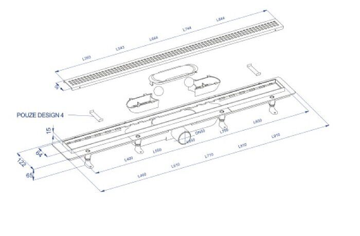 Ширина: 91см. Длина: 12,2 см. Высота: 6,5см Решетка: цвет: хром матовый. Материал решетки: нержавеющая сталь. Пропускная способность: 60 л/мин . Вид затвора: сухой/мокрый