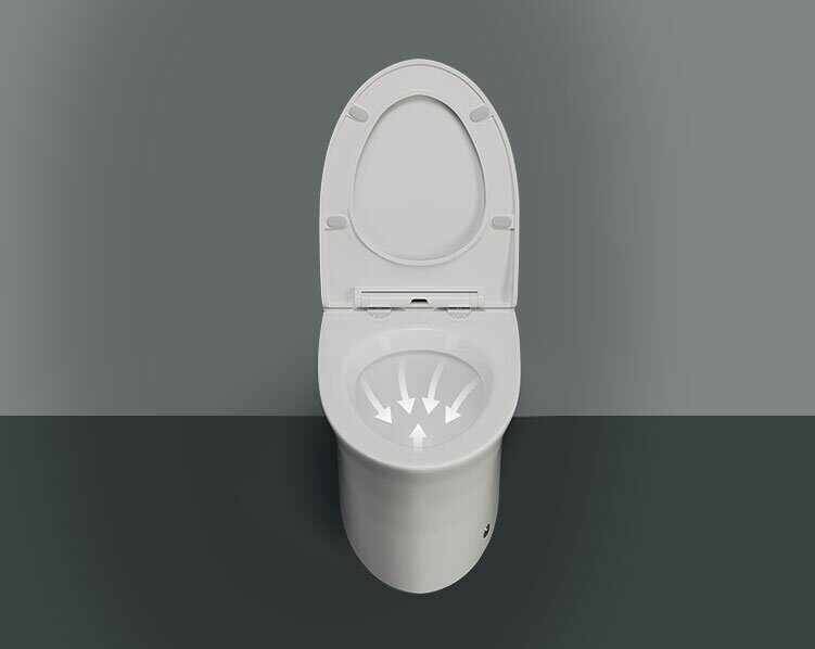 Эффективный импульсный смыв в два потока. Механизм направляет воду поочередно по двум каналам: первый омывает чашу, а второй под давлением проталкивает содержимое в канализацию.