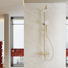 Высота 148см. Верхний душ 25х25см. Назначение: для душа, для ванны. Материал: латунь. Держатель лейки на стойке. Цвет: сатин золотой