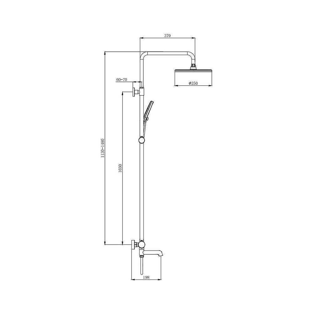 Высота 148см. Верхний душ 25х25см. Назначение: для душа, для ванны. Материал: латунь. Держатель лейки на стойке. Термостат. Цвет: черный
