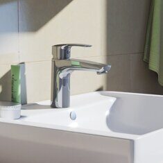 Смеситель для умывальника Ray имеет универсальный дизайн и подойдет для различных вариантов интерьерных решений. Покрытие устойчиво к появлению разводов и отпечатков пальцев. Аэратор в смесителе расположен под наклоном, направляя струю в удобную точку, что делает комфортным и мытье рук, и наполнение больших емкостей.
