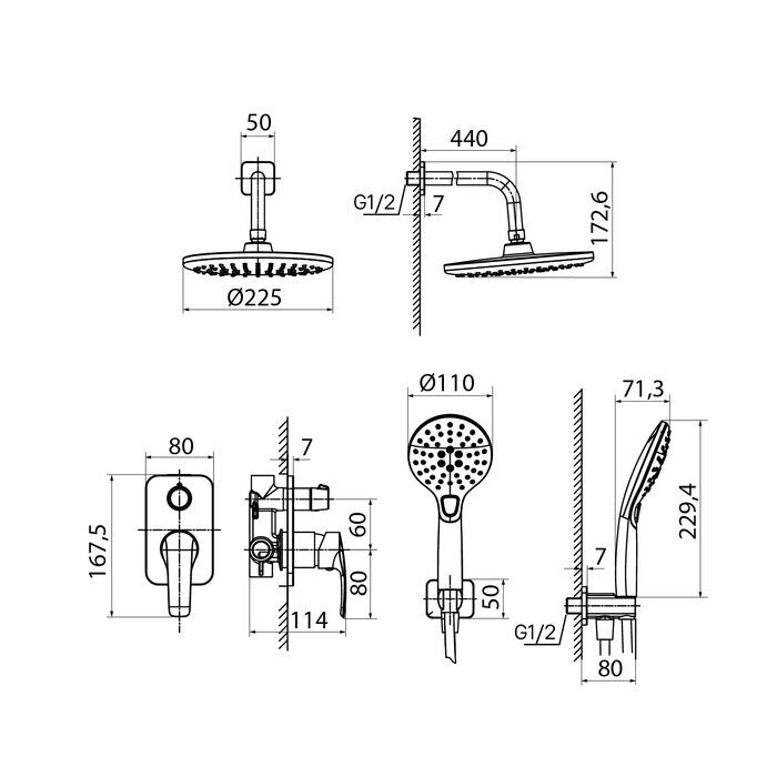 Оптимальная подборка сантехники Ray: смеситель, верхняя лейка с кронштейном для тропического душа, настенный излив, большая ручная лейка с 3 режимами, душевой шланг 1,5 м и выход для подключения шланга с держателем для лейки.