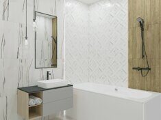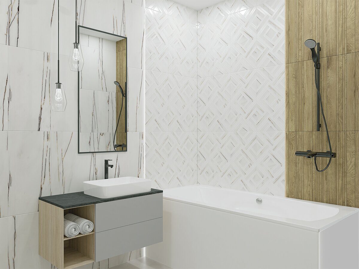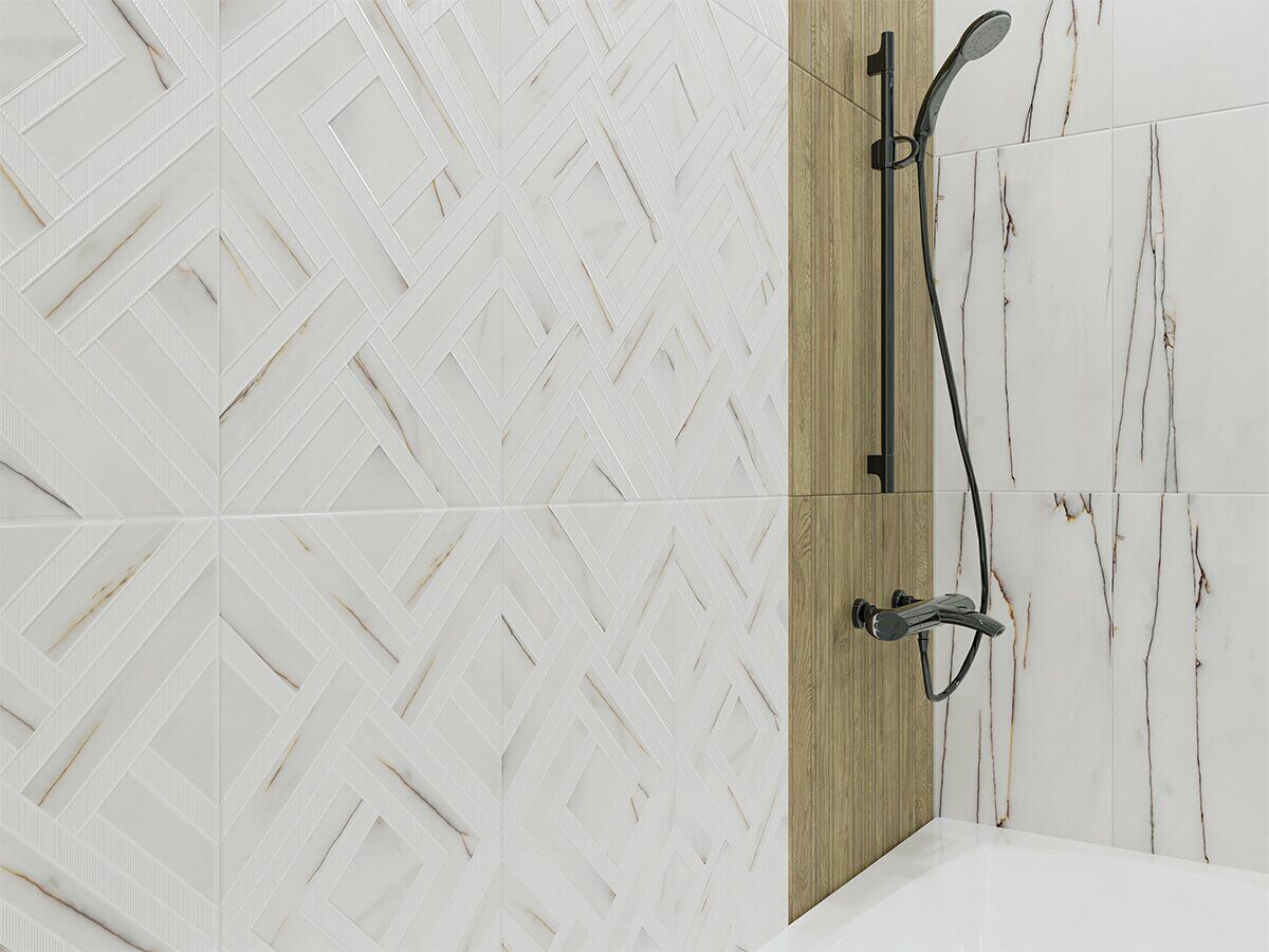 Размер: 31,5х63 см. Цвет: белый, под мрамор, с рисунком (геометрия). Матовая, sugar-эффект. Микрорельеф. Отпускается кратно упаковке: 1,59м2/8 шт