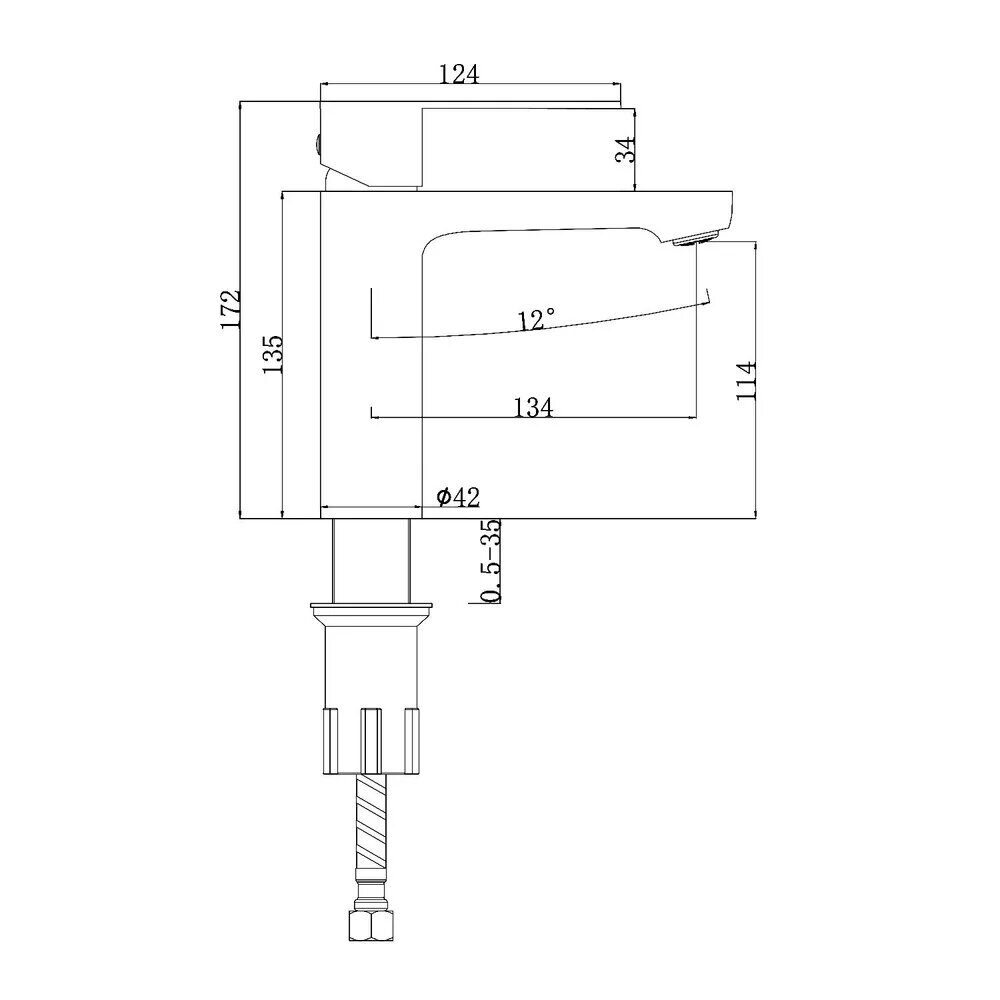Высота: 17,2 см. Высота излива: 11,4 см. Длина излива 13,4 см. Назначение: для раковины. Способ монтажа: на одно отверстие.  Цвет: Черный
