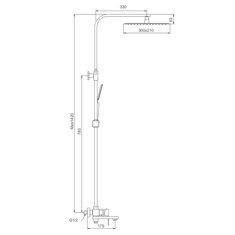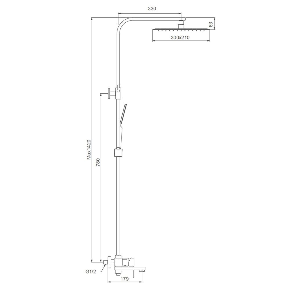 Высота: 142 см. Длина шланга: 150 см. Назначение: для душа, для ванны.  Материал: нержавеющая сталь. Держатель лейки на стойке. Картридж керамика 35 мм. Ручная лейка 3 режима. Тропический душ 300*210 мм. Цвет: Сатин.