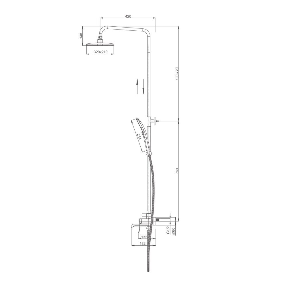 Высота: 148 см. Длина шланга: 150 см. Назначение: для душа, для ванны.  Материал: латунь. Держатель лейки на стойке. Картридж керамика 30 мм. Ручная лейка 3 режима. Тропический душ 320*210 см. Цвет: Графит.