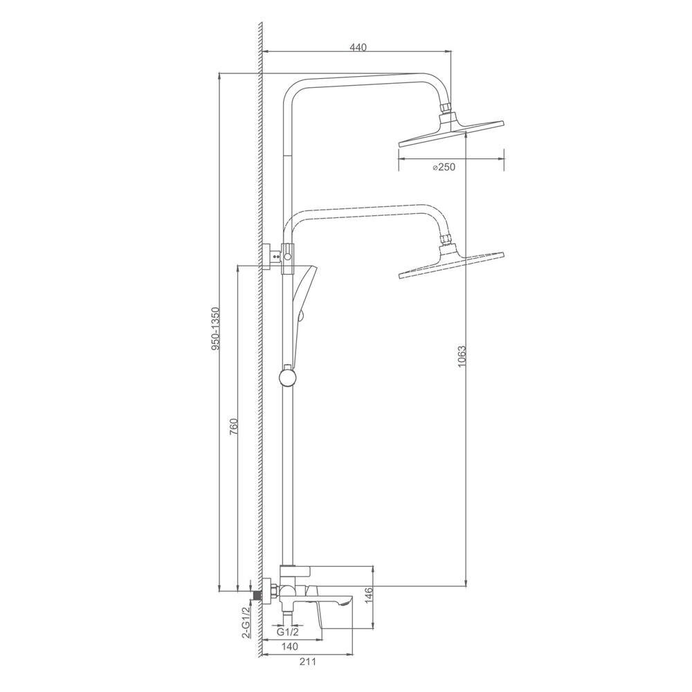 Высота: 135 см. Длина шланга: 150 см. Назначение: для душа, для ванны.  Материал: латунь. Держатель лейки на стойке. Картридж керамика 30 мм. Ручная лейка 3 режима. Тропический душ 25 см. Цвет: Графит.