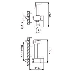 Глубина: 11,4 см. Высота: 19,7 см. Ширина: 18,6 см. Цвет: черный. Материал: нержавеющая сталь. Шланг: 1,2 м. Картридж: керамика 25 мм. Лейка 1 режим.