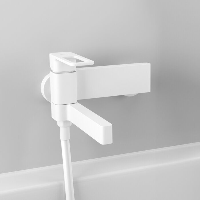 Смеситель для ванны, однозахватный, латунь, белый матовый цвет, керамический дивертор в изливе, керамический картридж Softap 35 мм, пластиковый аэратор Neoperl, излив складывается под корпус. Комплектация: эксцентрики с отражателями, крепеж