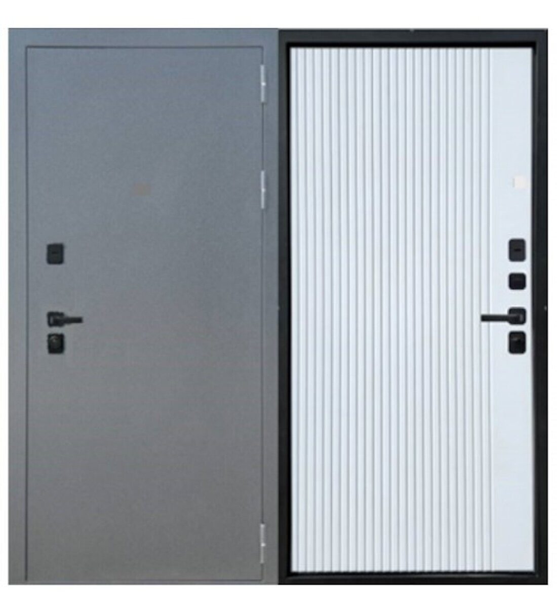 Внешнее покрытие: атмосферостойкое порошково-полимерное «Букле графит». Внутреннее покрытие: фрезерованная МДФ панель 10 мм, цвет – Бетон Лофт грей. Толщина дверного полотна: 110 мм. Глубина короба: 131 мм. Замки: 2 сувальдных Гардиан. Терморазрыв 24 мм: двухкамерный спейсер из ПВХ.
