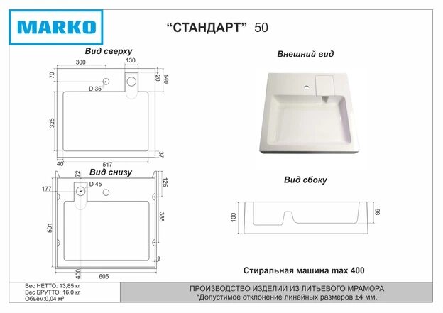 Размер: 50х55,5х4,5см. Материал: искусственный мрамор.