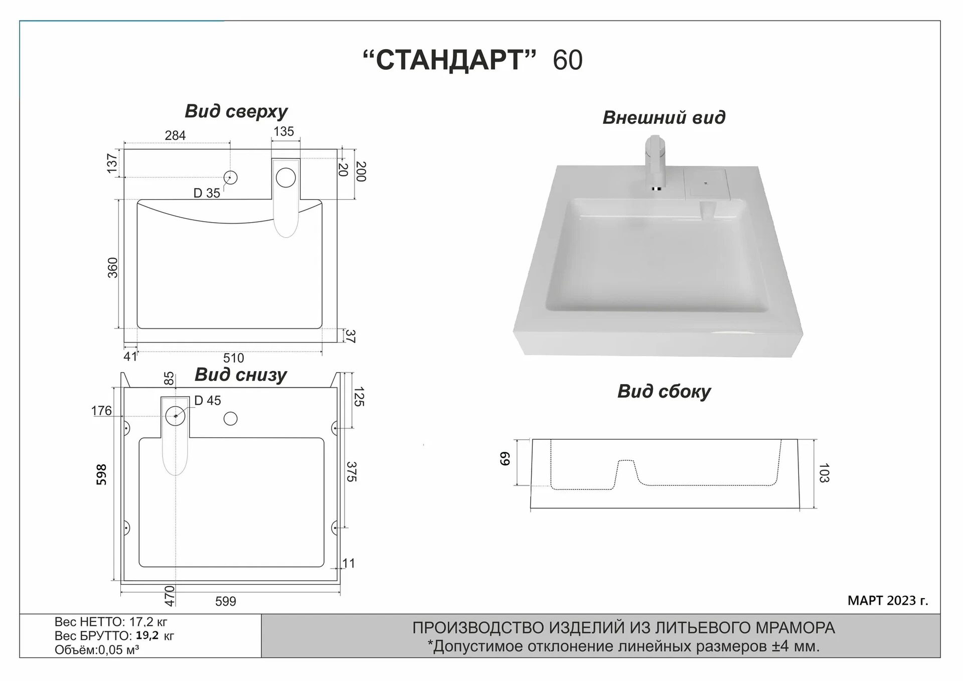 Размер: 60х60х4,5см. Материал: искусственный мрамор.