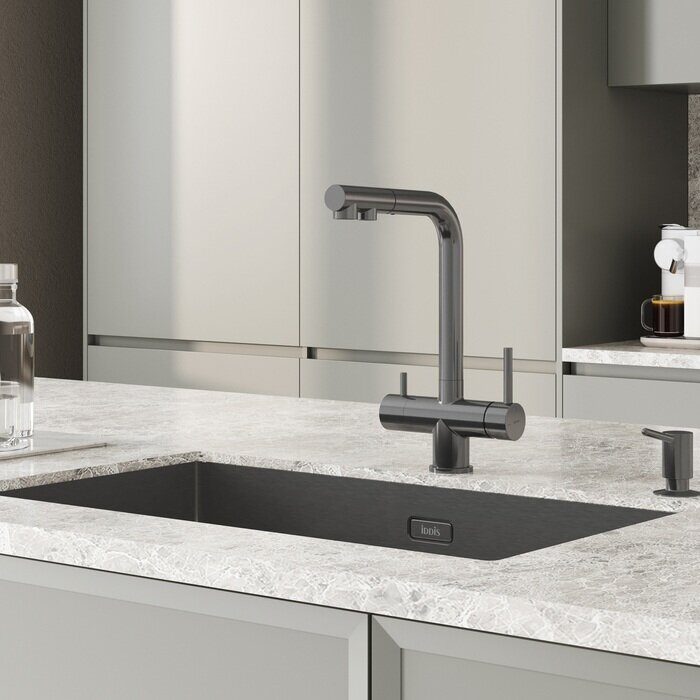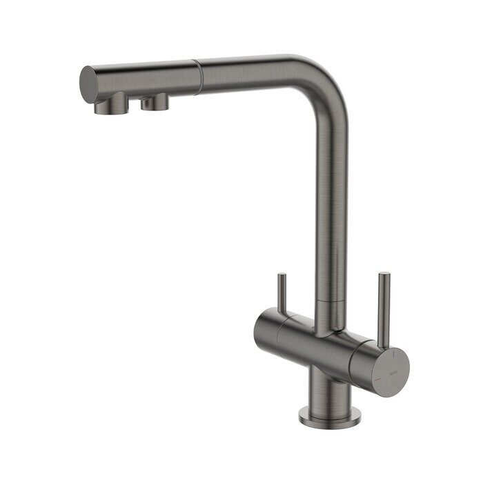 Смеситель Umbra в цвете графит – стильный дизайн и многофункциональность, необходимая на современной кухне. Удобная эргономичная ручка, питьевая вода из отдельного встроенного канала для фильтрованной воды и выдвижной излив – детали, которые сделают ежедневные хлопоты приятными.