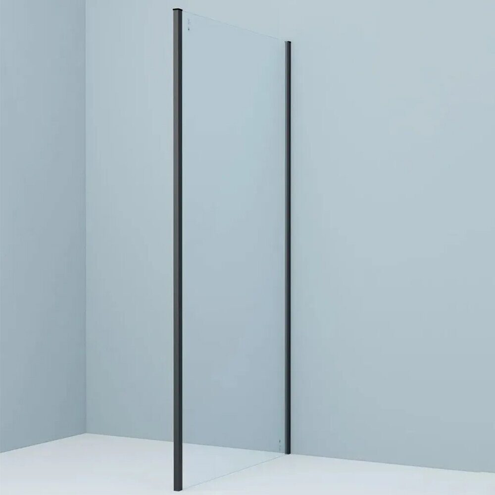 Размеры: 90х195 см. Прозрачное стекло 8 мм. Профиль: черный, анодированный алюминий. Фиксированная боковая панель без верхнего и нижнего профиля
