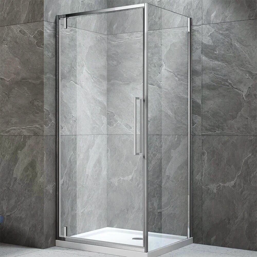 Размеры: 80х195 см. Прозрачное стекло 6 мм. Профиль: хром, анодированный алюминий. Фиксированная боковая панель без верхнего и нижнего профиля
