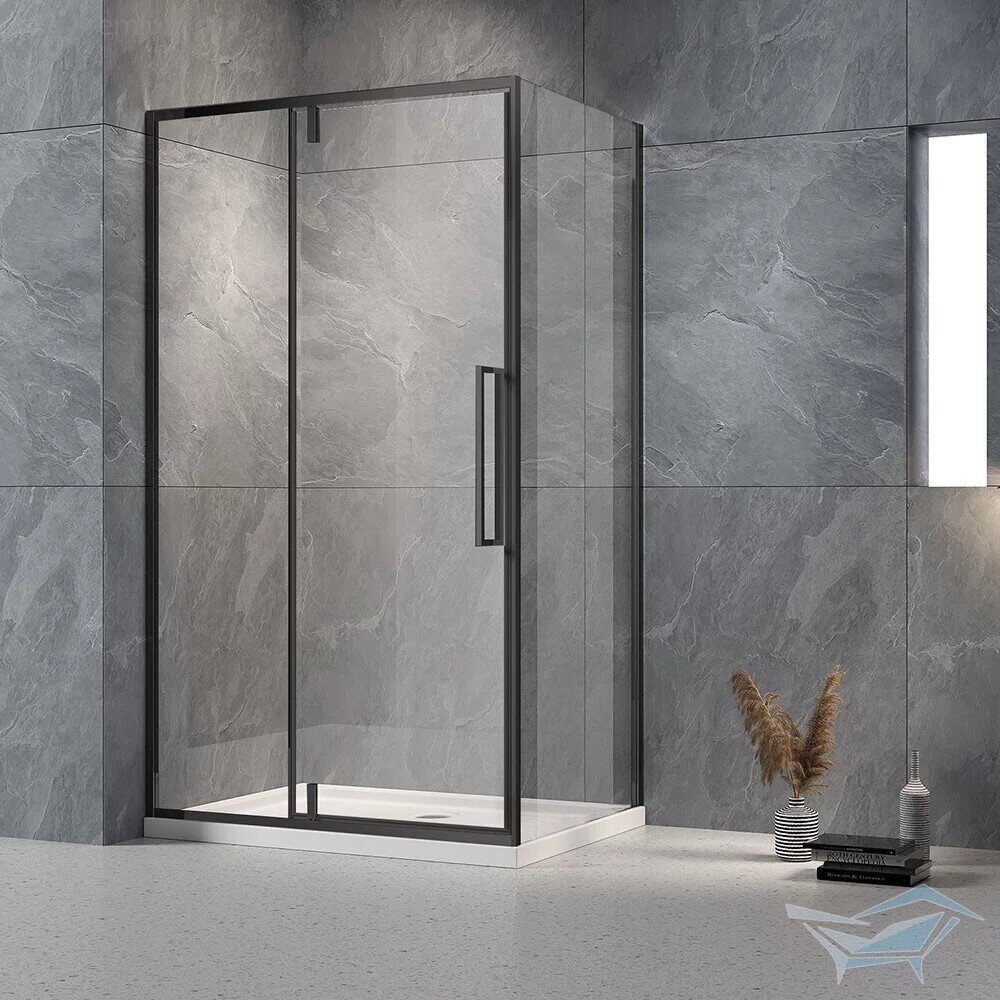 Размеры: 100х195 см. Прозрачное стекло 6 мм. Профиль: черный, анодированный алюминий. Фиксированная боковая панель без верхнего и нижнего профиля